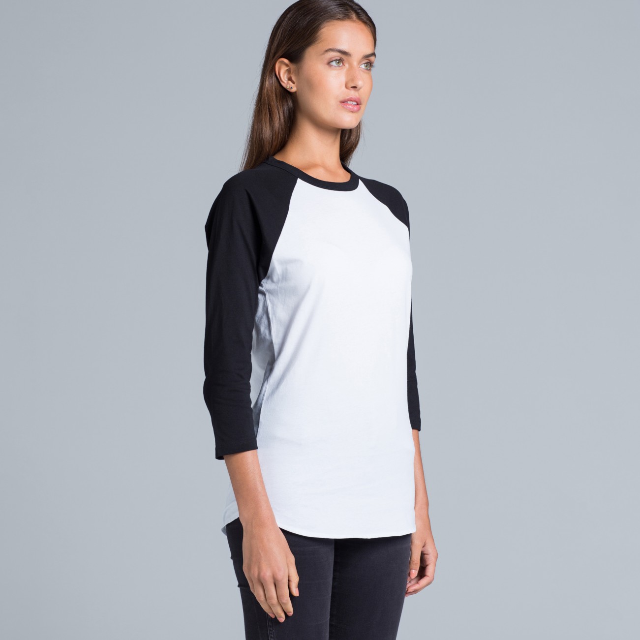 Crew neck, ¾ length raglan sleeves, curved tails
